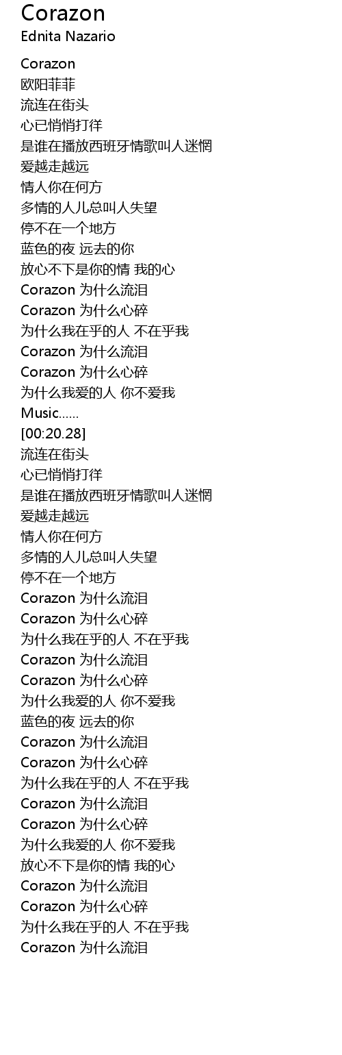 | [01:38.12] | Corazon 为什么心碎 |