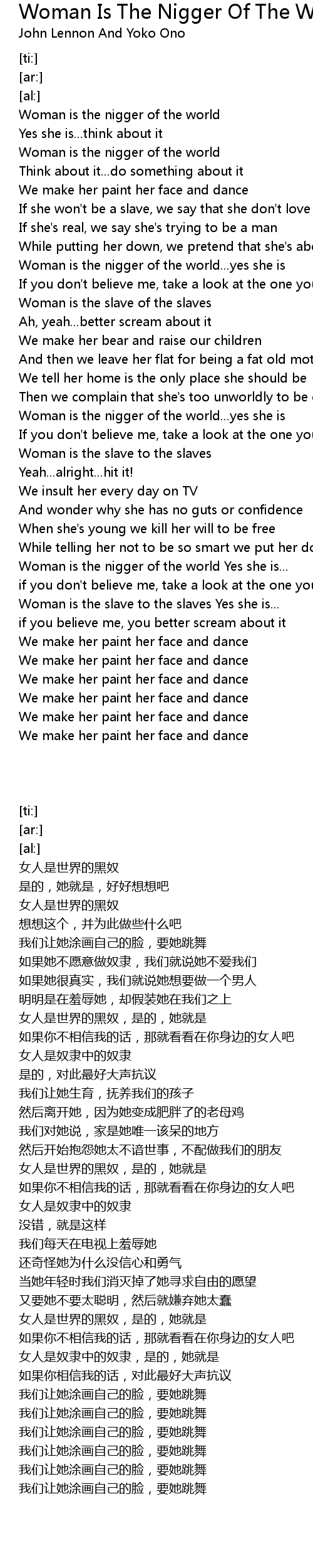 Woman is the nigger of the world Yes she is... |