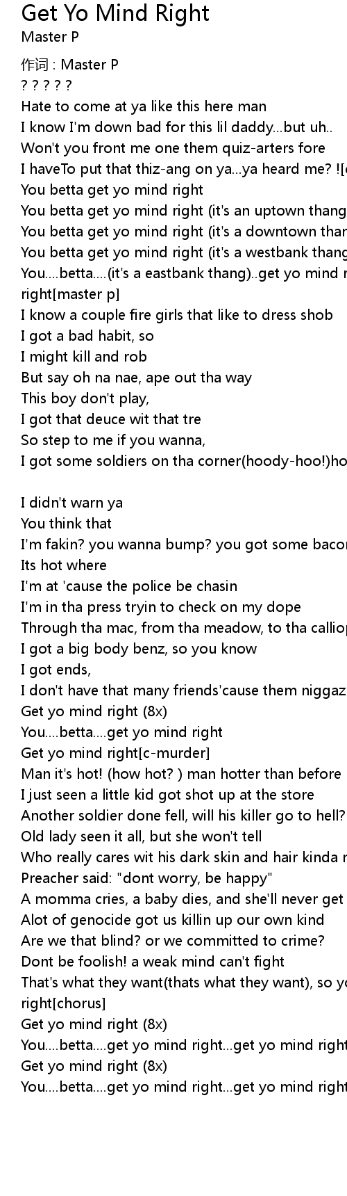 | You....betta....(it's a eastbank thang)..get yo mind right...get yo mind right[master p] | |