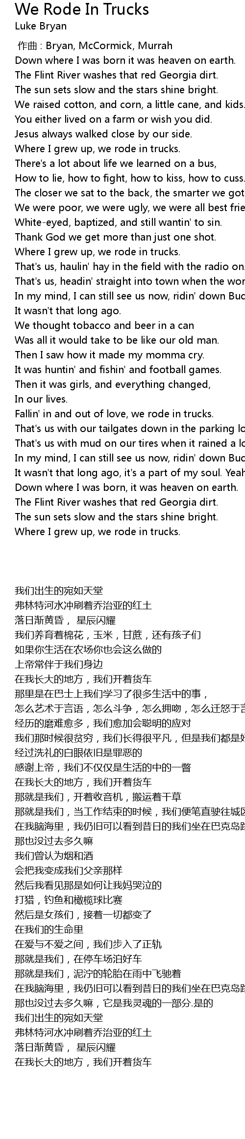 | [02:23.48] | Fallin' in and out of love, we rode in trucks. |