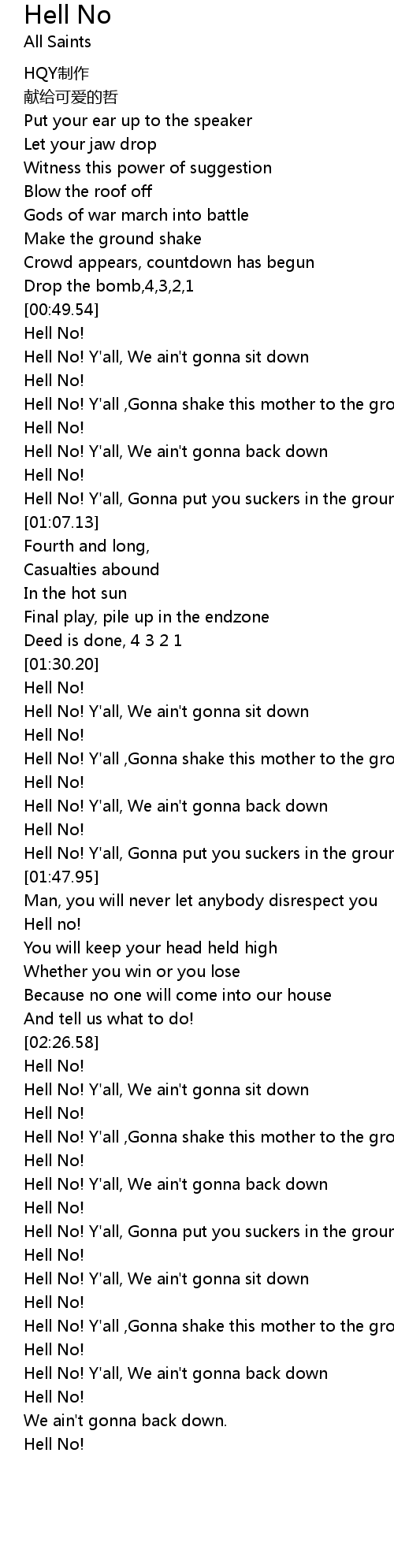| [00:59.08] | Hell No! Y' all, We ain' t gonna back down |