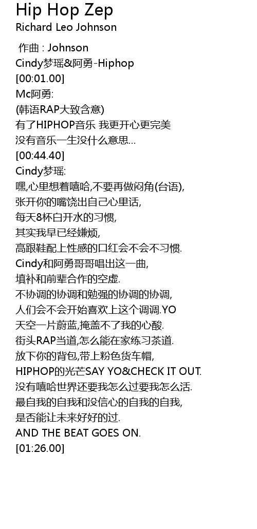 | [00:04.74] | yǒu le HIPHOP yīn yuè wǒ gèng kāi xīn gèng wán měi méi yǒu yīn yuè yī shēng méi shén me yì sī... |