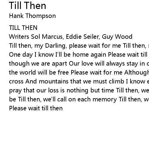 Till then, my Darling, please wait for me Till then, no matter when it may be One day I know I'll be home again Please wait till then Our dreams will live though we are apart Our love will always stay in our hearts Till then, when all the world will be free Please wait for me Although there are oceans we must cross And mountains that we must climb I know every gain must have a loss So pray that our loss is nothing but time Till then, we'll dream of what there will be Till then, we'll call on each memory Till then, when I will hold you again Please wait till then |