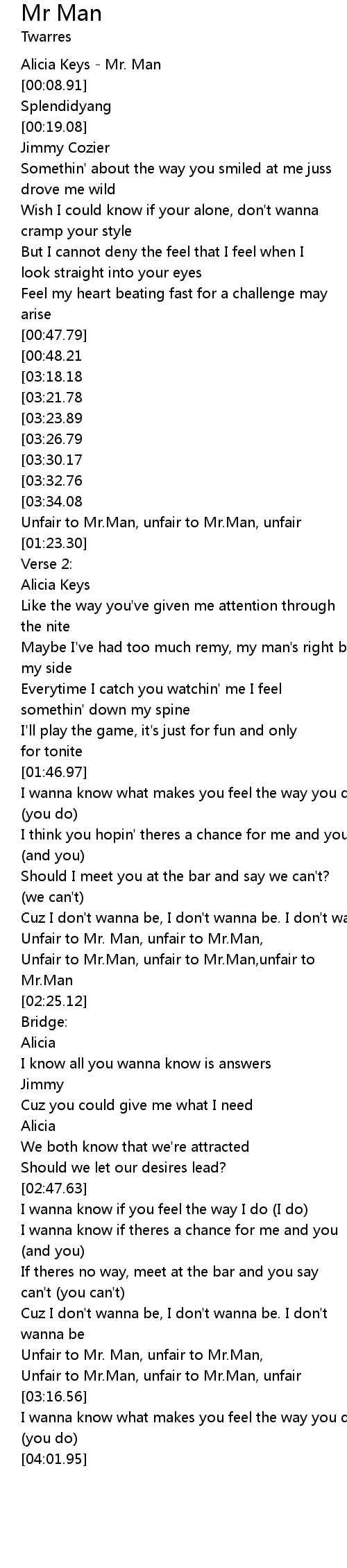 | [00:05.96] | Alicia Keys - Mr. Man |