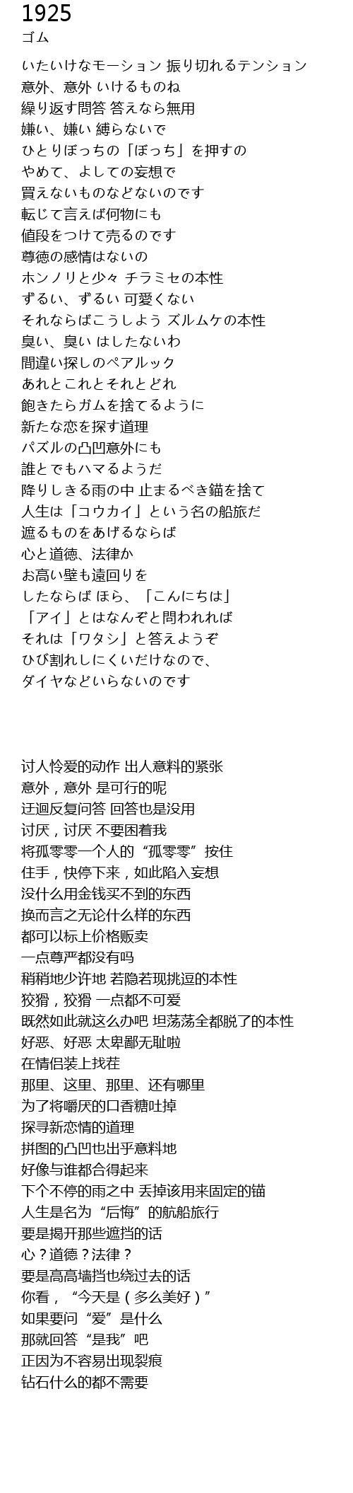 | [00:20.33] | いたいけなモーション 振り切れるテンション |