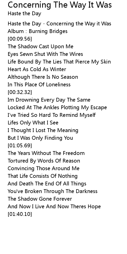 | [00:01.52] | Haste the Day Concerning the Way it Was |