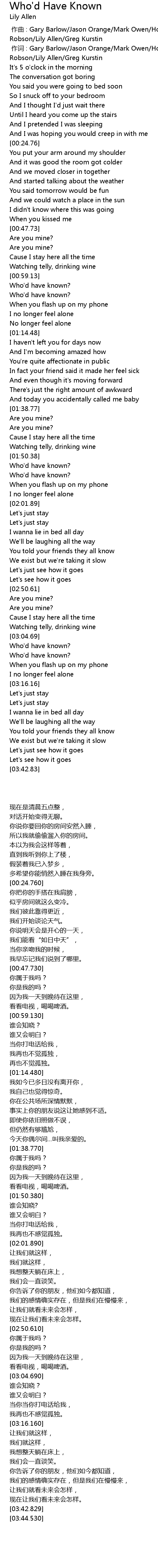 | [00:00.13] | zuò cí : Gary Barlow Jason Orange Mark Owen Howard Donald Steve Robson Lily Allen Greg Kurstin |