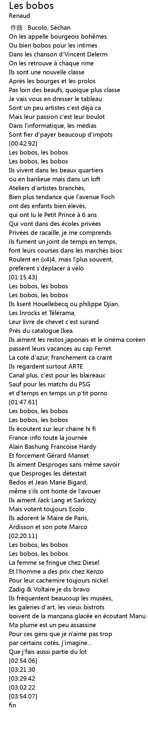 | [00:18.11] | On les appelle bourgeois bohêmes |