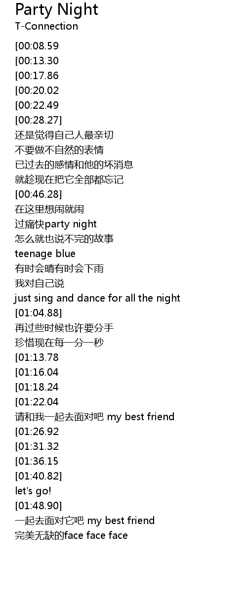 | [02:14.20][00:08.59] | cóng jīn wǎn dào míng tiān zǎo chén shì gè party night |