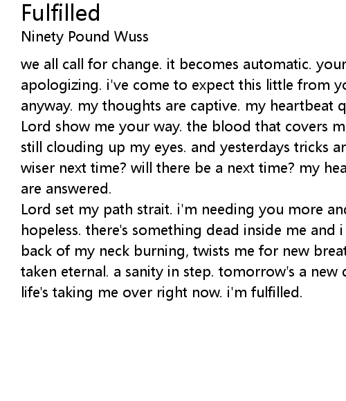 Lord set my path strait. i'm needing you more and more. i'm finding myself so hopeless. there's something dead inside me and i know your burning here too. the back of my neck burning, twists me for new breath. becoming fulfilled. new life taken eternal. a sanity in step. tomorrow's a new death. all is fulfilled. new life's taking me over right now. i'm fulfilled. |