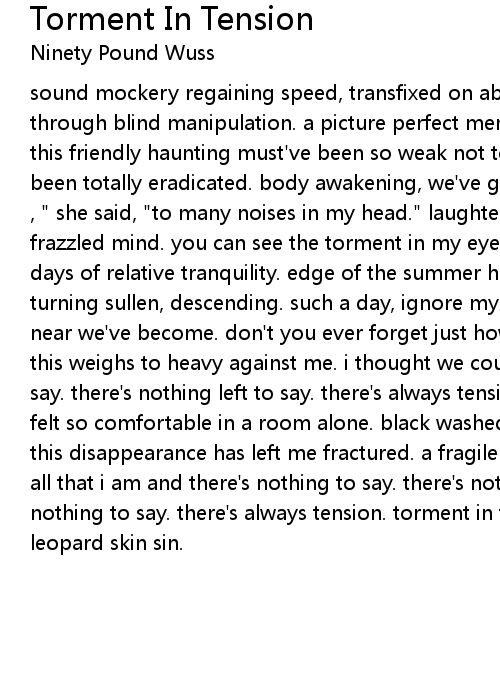 sound mockery regaining speed, transfixed on absolution. attempting to overthrow through blind manipulation. a picture perfect memory so real. surveillance of this friendly haunting must've been so weak not to count on murder. emersion has been totally eradicated. body awakening, we've gained control. "i'm so messed up , " she said, "to many noises in my head." laughter reverberating through this frazzled mind. you can see the torment in my eyes. die in my eyes, die. three days of relative tranquility. edge of the summer heat. the jest of this city. turning sullen, descending. such a day, ignore my darkening but don't forget how near we've become. don't you ever forget just how near to silence we've become. this weighs to heavy against me. i thought we could, but there's nothing left to say. there's nothing left to say. there's always tension. torment in tension. i felt so comfortable in a room alone. black washed walls. no words, just silence. this disappearance has left me fractured. a fragile wreck in a storm consuming all that i am and there's nothing to say. there's nothing to say. there's nothing to say. there's always tension. torment in tension. i'm impaired by your leopard skin sin. |