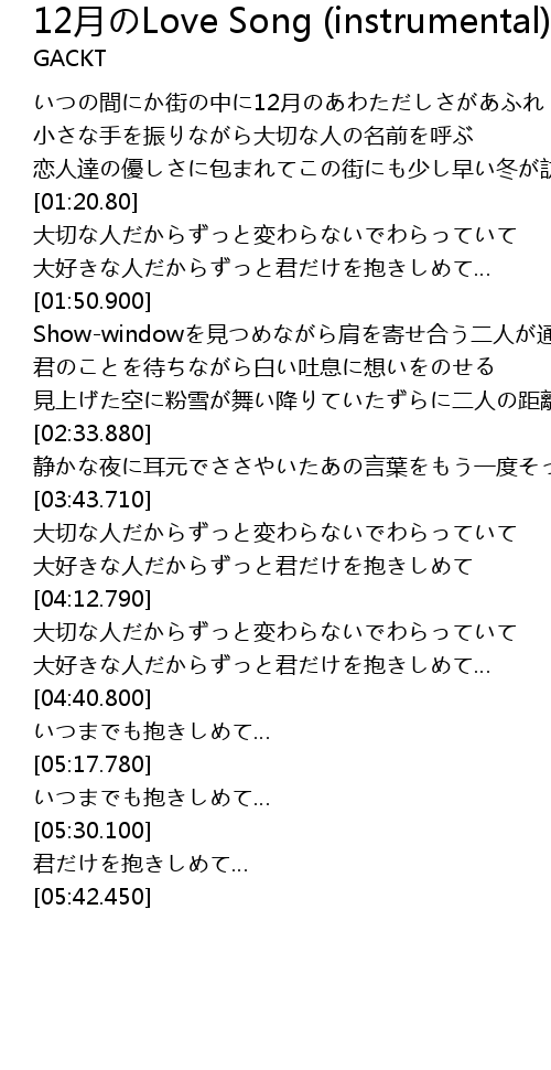 | [02:17.180] | 見上げた空に粉雪が舞い降りていたずらに二人の距離をそっと近づける |