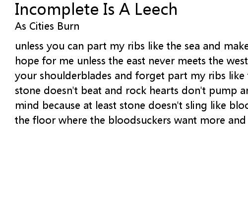 | unless you can part my ribs like the sea and make stone beat, then there's no hope for me unless the east never meets the west unless you set my sin between your shoulderblades and forget part my ribs like the sea and change me 'cause stone doesn't beat and rock hearts don't pump anything but i've grown not to mind because at least stone doesn't sling like blood or spill like guts across the floor where the bloodsuckers want more and more and more |