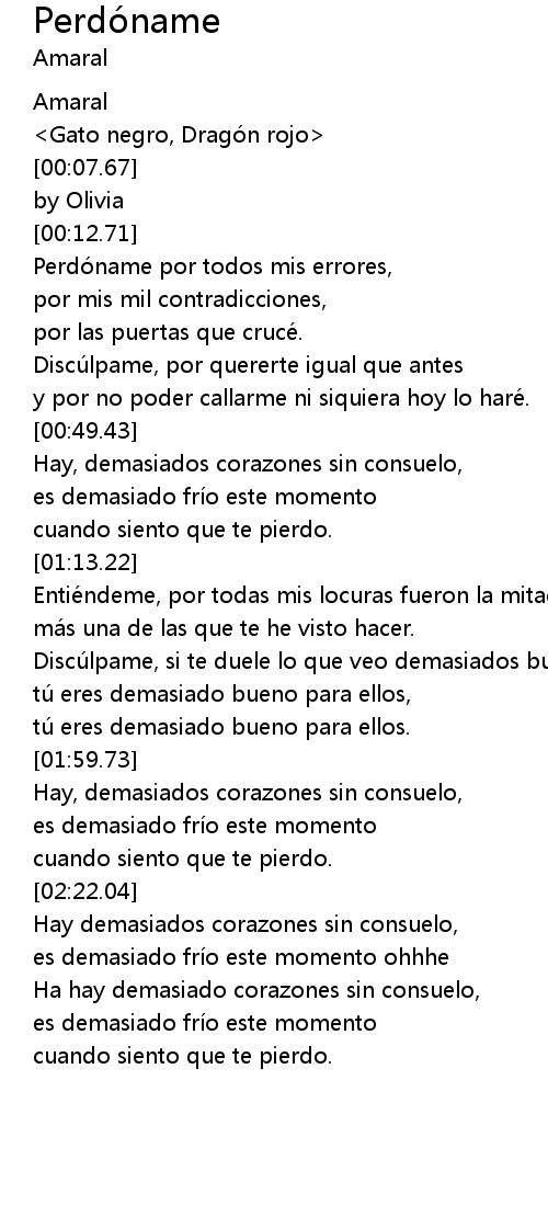 | [00:34.12] | Discúlpame, por quererte igual que antes |