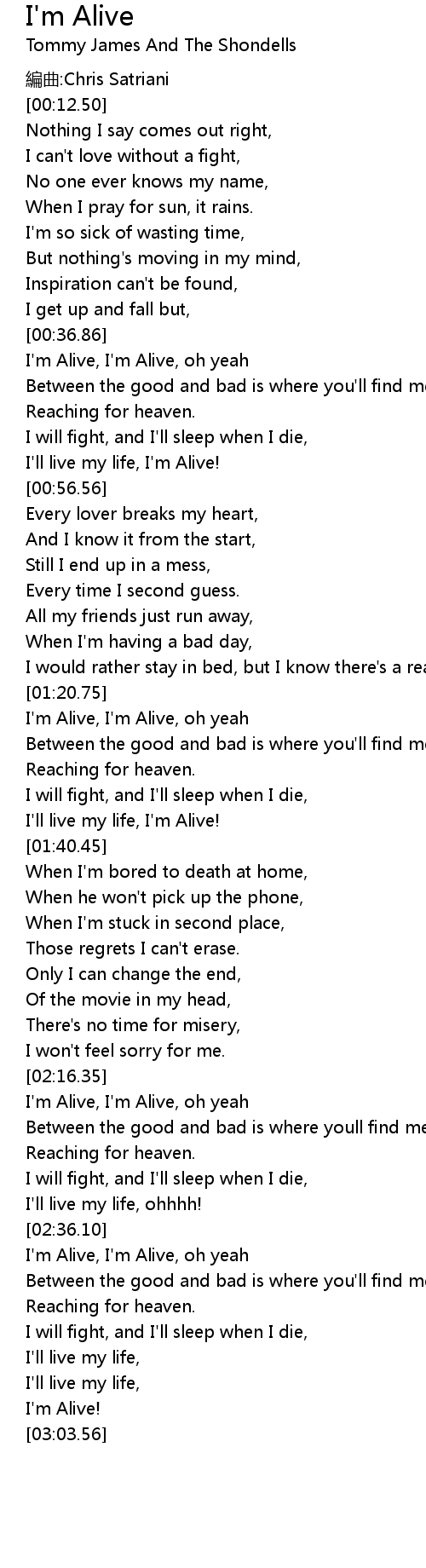 | [02:16.98] | I'm Alive, I'm Alive, oh yeah |