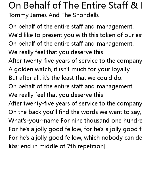 For he's a jolly good fellow, which nobody can deny. [repeat 6 times with ad libs; end in middle of 7th repetition] |
