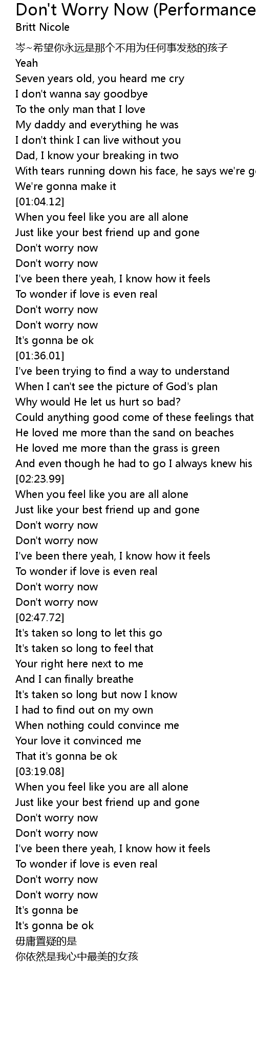| Song | Don't Worry Now (Performance Track In Key Of G Without Background Vocals) |