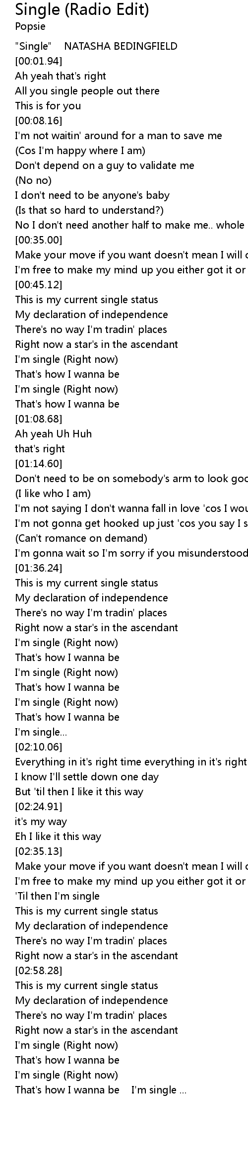 | [02:00.97] | I'm single (Right now) |