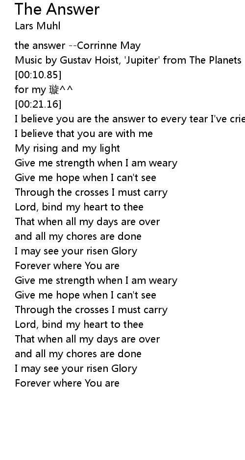 | [00:04.80] | the answer --Corrinne May |