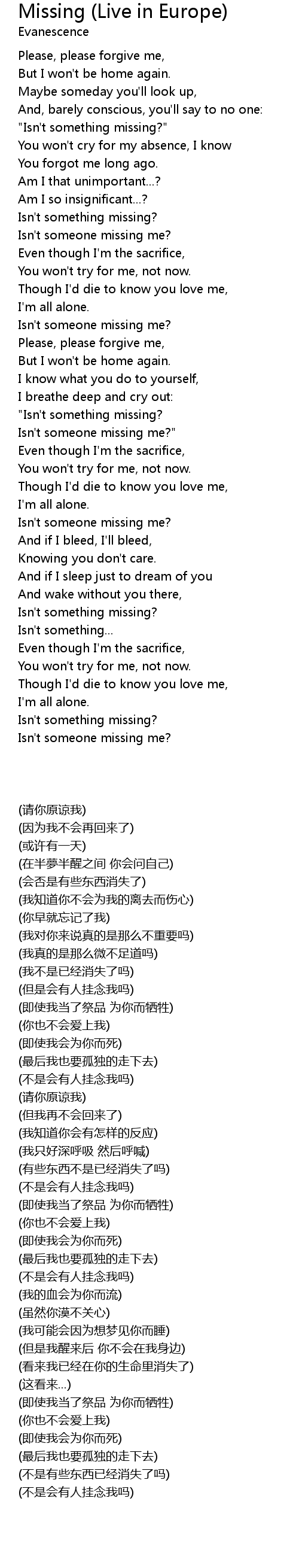 Missing (Live in Europe) Lyrics