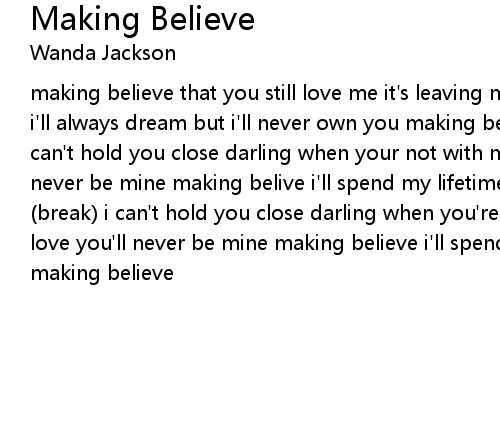 | making believe that you still love me it's leaving me alone and so blue still i'll always dream but i'll never own you making believe it's all i can do i can't hold you close darling when your not with me you're somebody's love you'll never be mine making belive i'll spend my lifetime loving you and making believe (break) i can't hold you close darling when you're not with me you're somebody's love you'll never be mine making believe i'll spend my lifetime loving you and making believe |