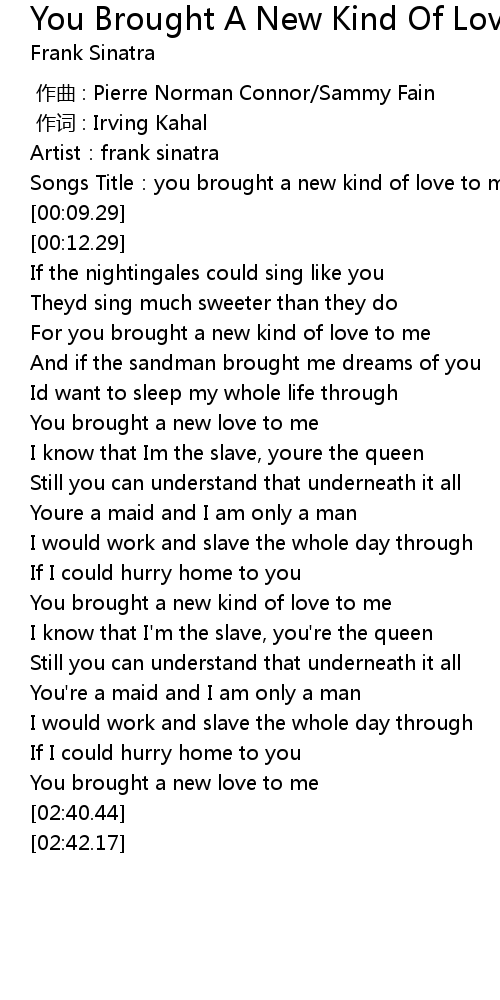 | [00:03.93] | Songs Title:you brought a new kind of love to me |