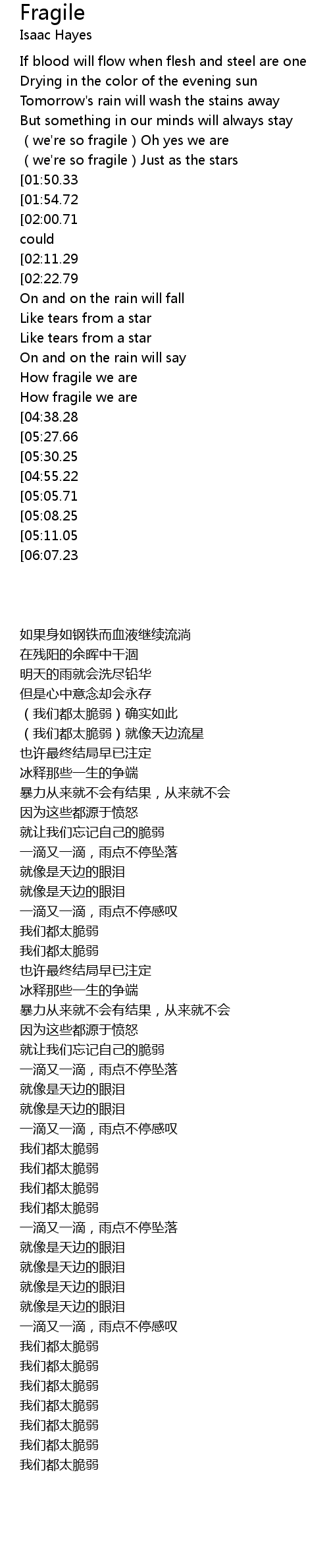 | [01:38.16] | (we're so fragile)Oh yes we are |