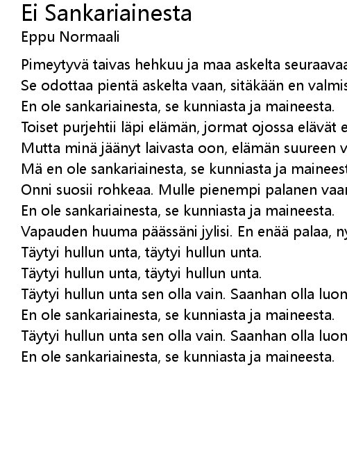| Mä en ole sankariainesta, se kunniasta ja maineesta. | |