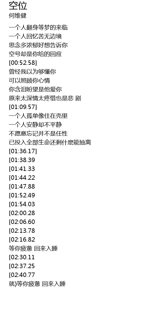 | [03:07.73][01:54.03] | 在我身旁 的空位 |