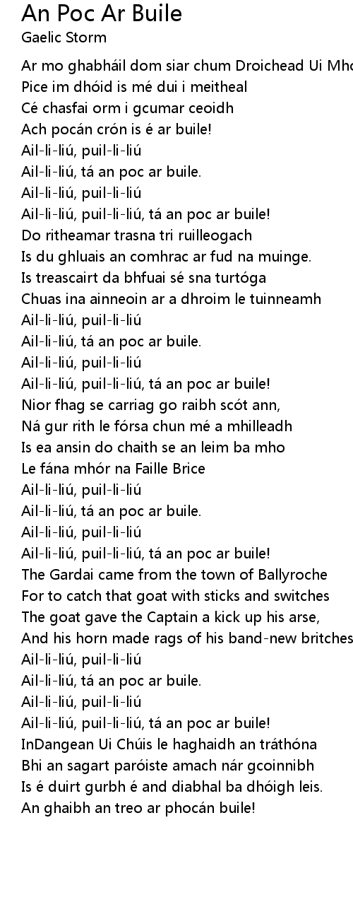 | Ail-li-liú, puil-li-liú, tá an poc ar buile! | |