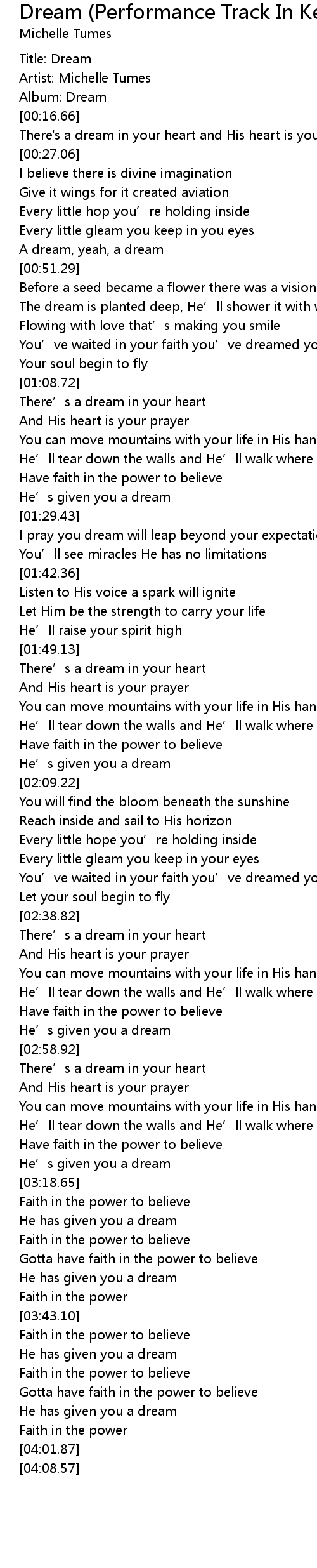 | [00:20.12] | There's a dream in your heart and His heart is your prayer... |