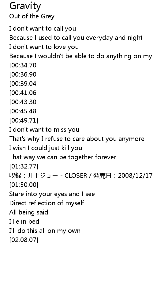 | [01:17.82][00:34.70] | Gravity starts to pull me down a little |