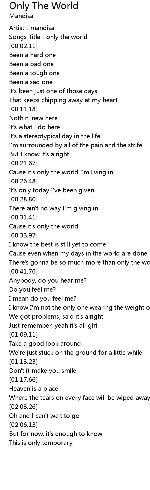 | [00:23.41] | Cause it' s only the world I' m living in |
