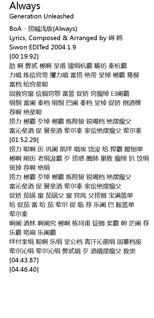 | [00:00.88] | BoA - 捞喊浅版(Always) |