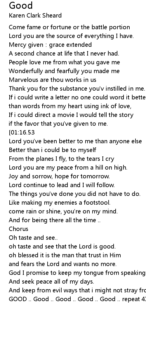 | [01:08.09][01:16.53][01:33.61] | Lord you've been good, good, good. |