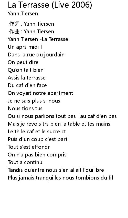 | [00:00.65] | Yann Tiersen La Terrasse |