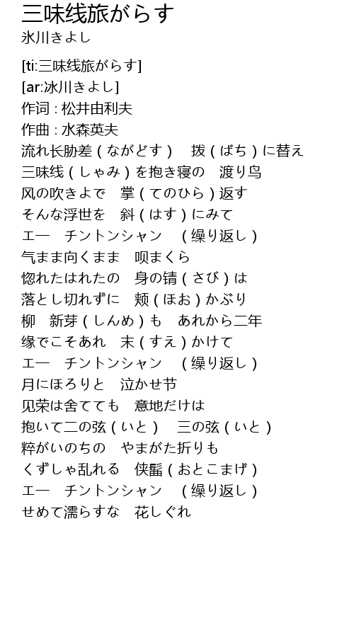 | [00:35.349] | 三味线(しゃみ)を抱き寝の 渡り鸟 |