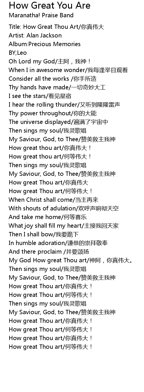 | [02:16.98] | My God How great Thou art shén ā, nǐ zhēn wěi dà. |
