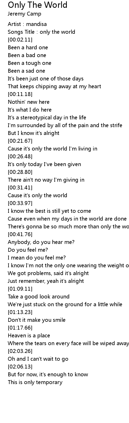 | [00:23.41] | Cause it' s only the world I' m living in |
