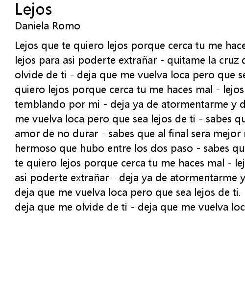 | Lejos que te quiero lejos porque cerca tu me haces mal lejos como el cielo lejos para asi poderte extra ar quitame la cruz de amarte y deja que me olvide de ti deja que me vuelva loca pero que sea lejos de ti. Lejos que te quiero lejos porque cerca tu me haces mal lejos para no tocarte y que no estes temblando por mi deja ya de atormentarme y deja que me olvide de ti deja que me vuelva loca pero que sea lejos de ti sabes que lo nuestro siempre fue un amor de no durar sabes que al final sera mejor no continuar sabes que lo mas hermoso que hubo entre los dos paso sabes que no te podre olvidar. Lejos que te quiero lejos porque cerca tu me haces mal lejos como el cielo lejos para asi poderte extra ar deja ya de atormentarme y deja que me olvide de ti deja que me vuelva loca pero que sea lejos de ti. Quitame la cruz de amarte y deja que me olvide de ti deja que me vuelva loca pero que sea lejos de ti. |