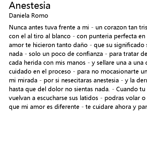 | Nunca antes tuva frente a mi un corazon tan triste y golpeado el dolor jugo con el al tiro al blanco con punteria perfecta en cada caso en nombre del amor te hicieron tanto da o que su significado sabe amargo no vengo a pedir nada solo un poco de confianza para tratar de darte alivio y calma. Unire cada herida con mis manos y sellare una a una con un beso tendre mucho cuidado en el proceso para no mocasionarte un nuevo da o llenare de ternura mi mirada por si nesecitaras anestesia y la derramare en dosis peque as hasta que del dolor no sientas nada. Cuando tu corazon se sienta fuerte y vuelvan a escucharse sus latidos podras volar o quedarte conmigo si sientes que mi amor es diferente te cuidare ahora y para siempre. |