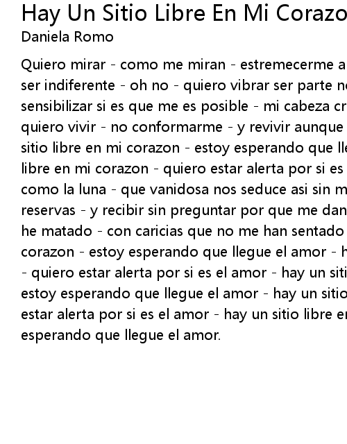 | Quiero mirar - como me miran - estremecerme al contacto de otra piel - no quiero ser indiferente - oh no - quiero vibrar ser parte no un adorno mas - sensibilizar si es que me es posible - mi cabeza cruel - que piensa condenar - quiero vivir - no conformarme - y revivir aunque me mate al corazon - hay un sitio libre en mi corazon - estoy esperando que llegue el amor - hay un sitio libre en mi corazon - quiero estar alerta por si es el amor. - No quiero ser como la luna - que vanidosa nos seduce asi sin mas - dar lo que tengo sin reservas - y recibir sin preguntar por que me dan - ni desengañar al hambre que he matado - con caricias que no me han sentado bien - hay un sitio libre en mi corazon - estoy esperando que llegue el amor - hay un sitio libre en mi corazon - quiero estar alerta por si es el amor - hay un sitio libre en mi corazon - estoy esperando que llegue el amor - hay un sitio libre en mi corazon - quiero estar alerta por si es el amor - hay un sitio libre en mi corazon - estoy esperando que llegue el amor. |