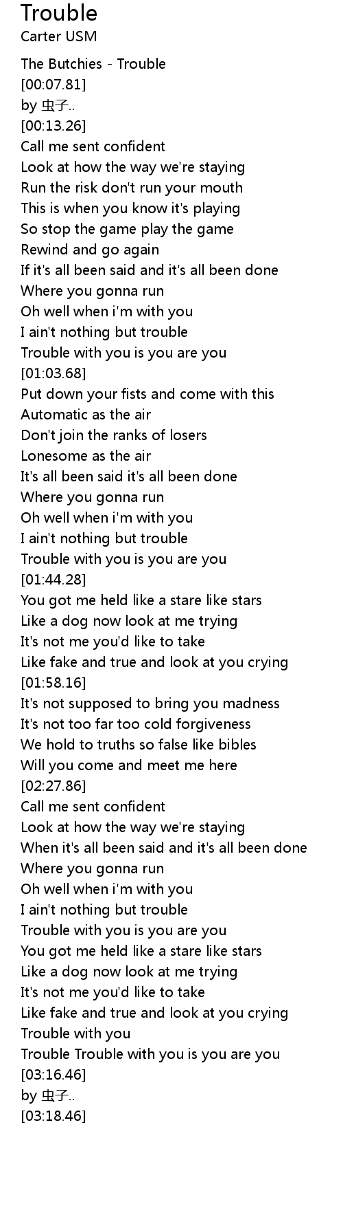| [03:10.53] | Trouble Trouble with you is you are you |