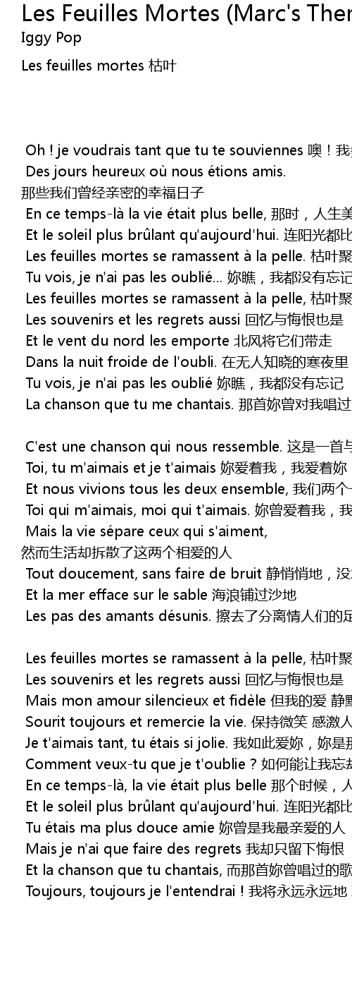 | Les feuilles mortes se ramassent a la pelle, ku ye ju long zai chan zi shang | |