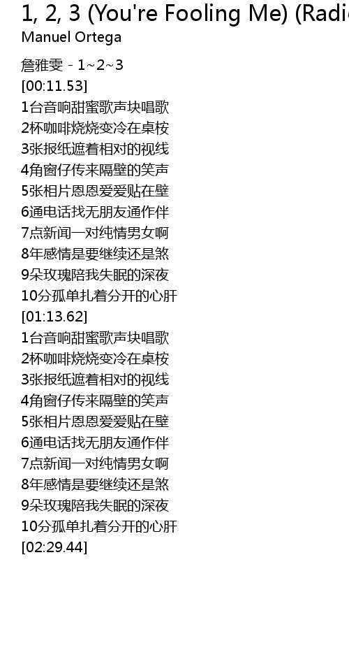 | [00:07.53] | 詹雅雯 - 1~2~3 |