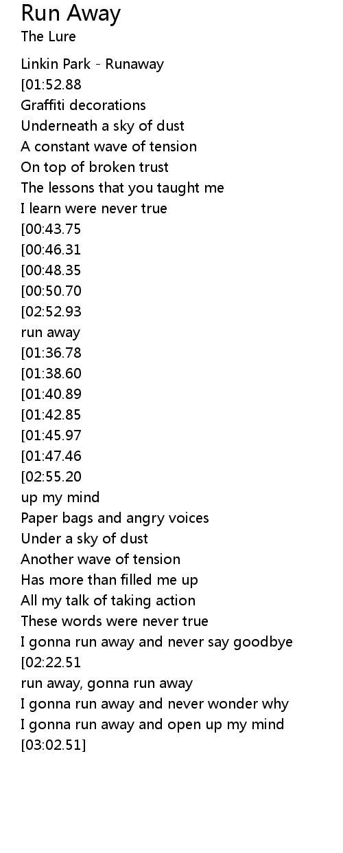 | [02:24.83][02:22.51][02:20.12][02:18.36][02:11.45][02:08.99][02:02.57][02:00.84] | Gonna run away, gonna run away |