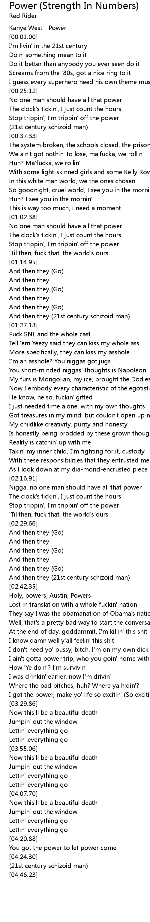 | [02:17.21] | Nigga, no one man should have all that power |