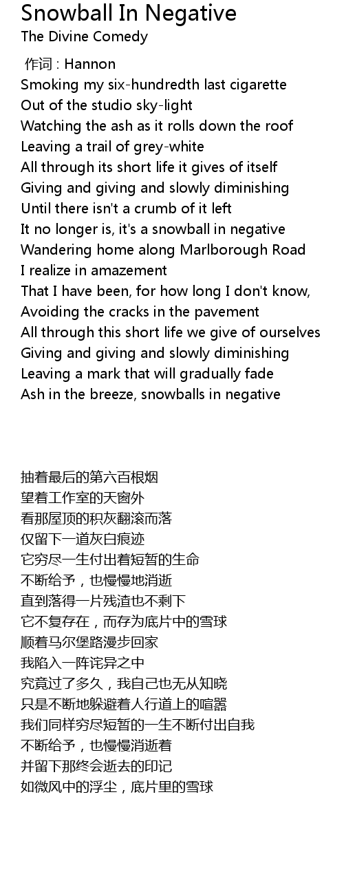 | [03:01.000] | Ash in the breeze, snowballs in negative |