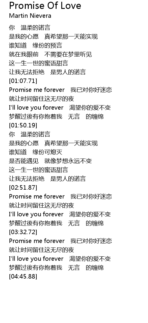 | [01:08.98] | Promise me forever wo yi dui ni hao mi lian |