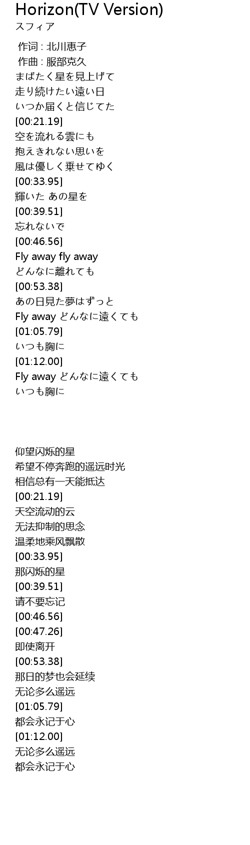 | [01:12.76] | Fly away どんなに遠くても |